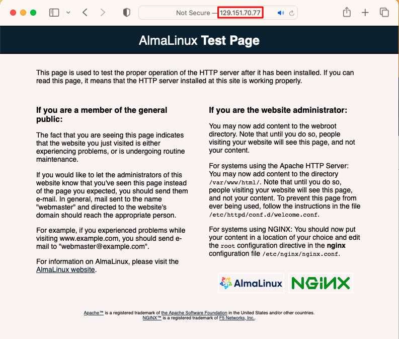 On your network firewall you need to allow TCP traffic through on ports 80 (HTTP) & 443 (HTTPS). You also need to allow traffic through your device firewall. To do this you need to add the following rules to firewalld your Alma Linux install.