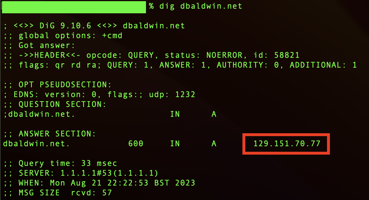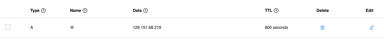 We need to set our domain address to have an A record to point to our server. It can take some time for the change to propagate around all the DNS servers across the internet. You may wish to also add a C Name for www. and point it to your A record.