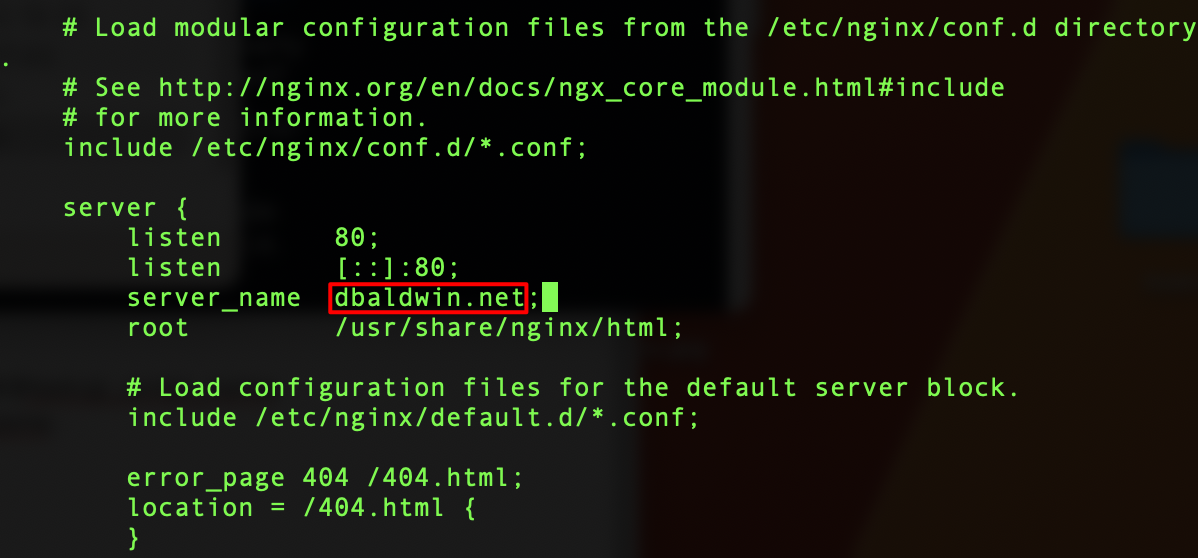 We need to edit some Nginx configuration files to enter in our domain name. I found my minimal version of Alma Linux does not have Nano installed so I had to use vi(m) for my text editing.